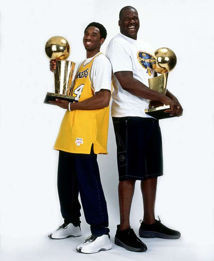 2001年6月,在湖人队2001年NBA总冠军游行之后,洛杉矶湖人队的沙奎尔·奥尼尔和科比·布莱恩特合影。 视觉中国图
